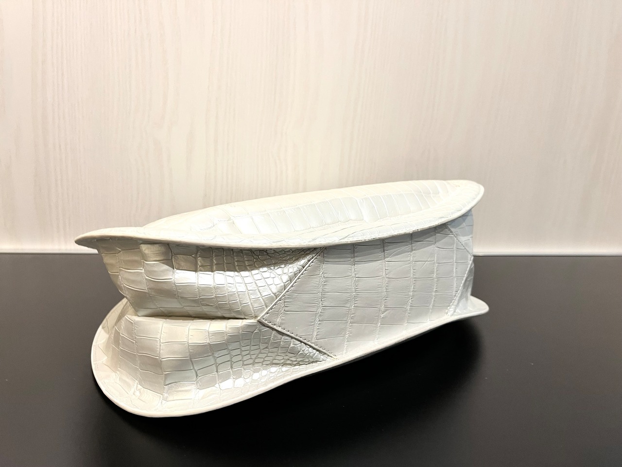 パールホワイトで両面センター取りのクロコダイルバッグです