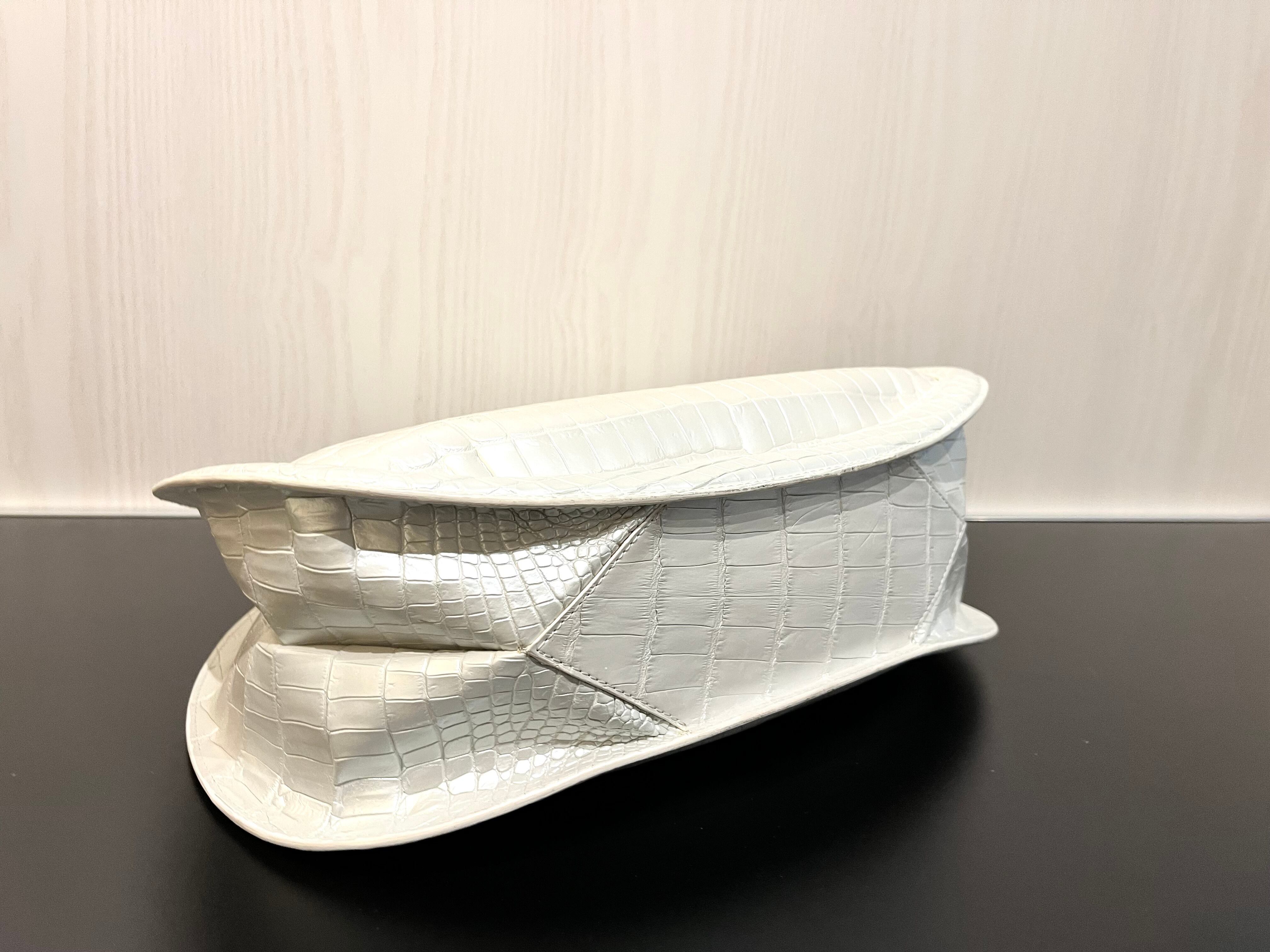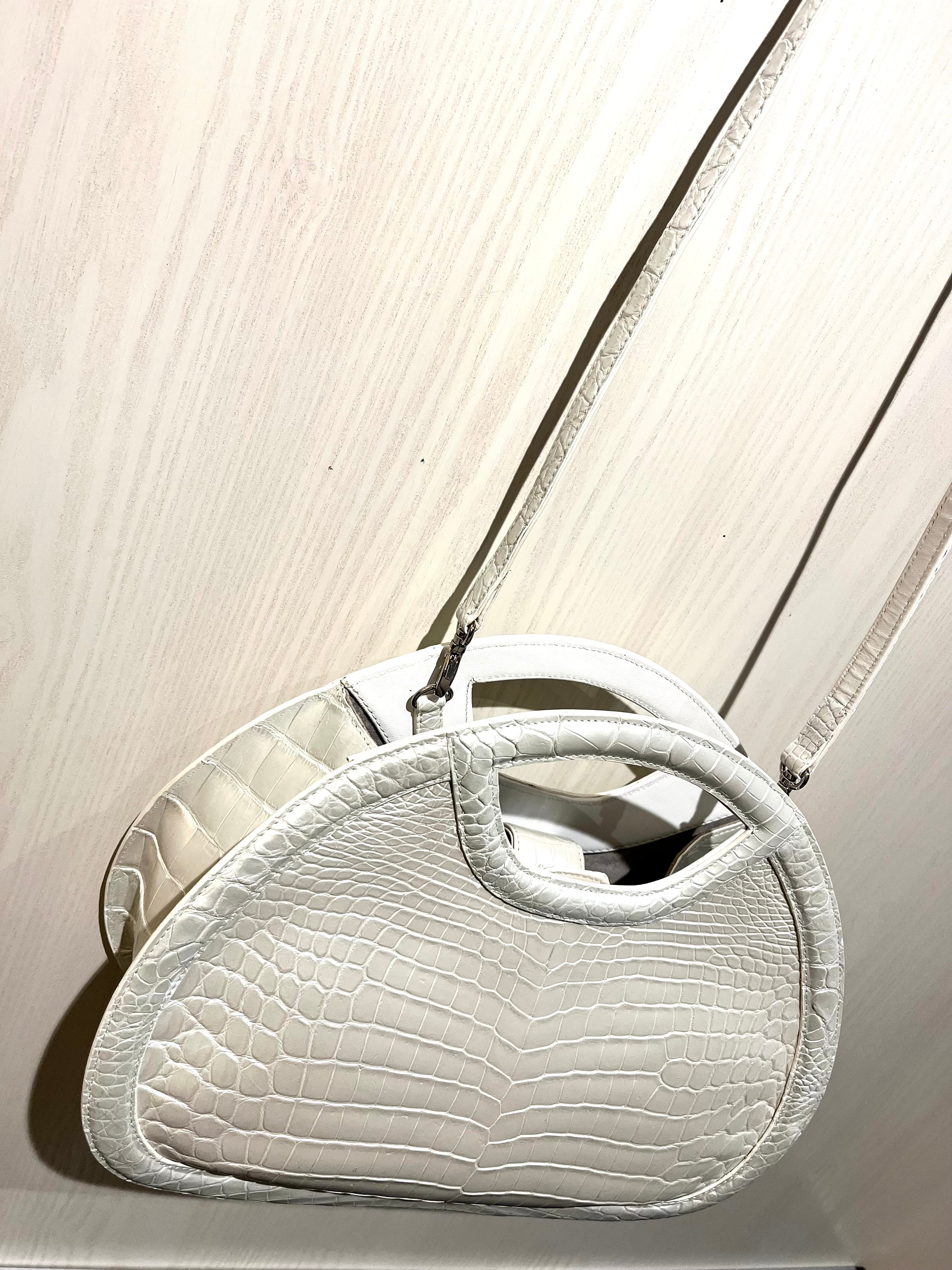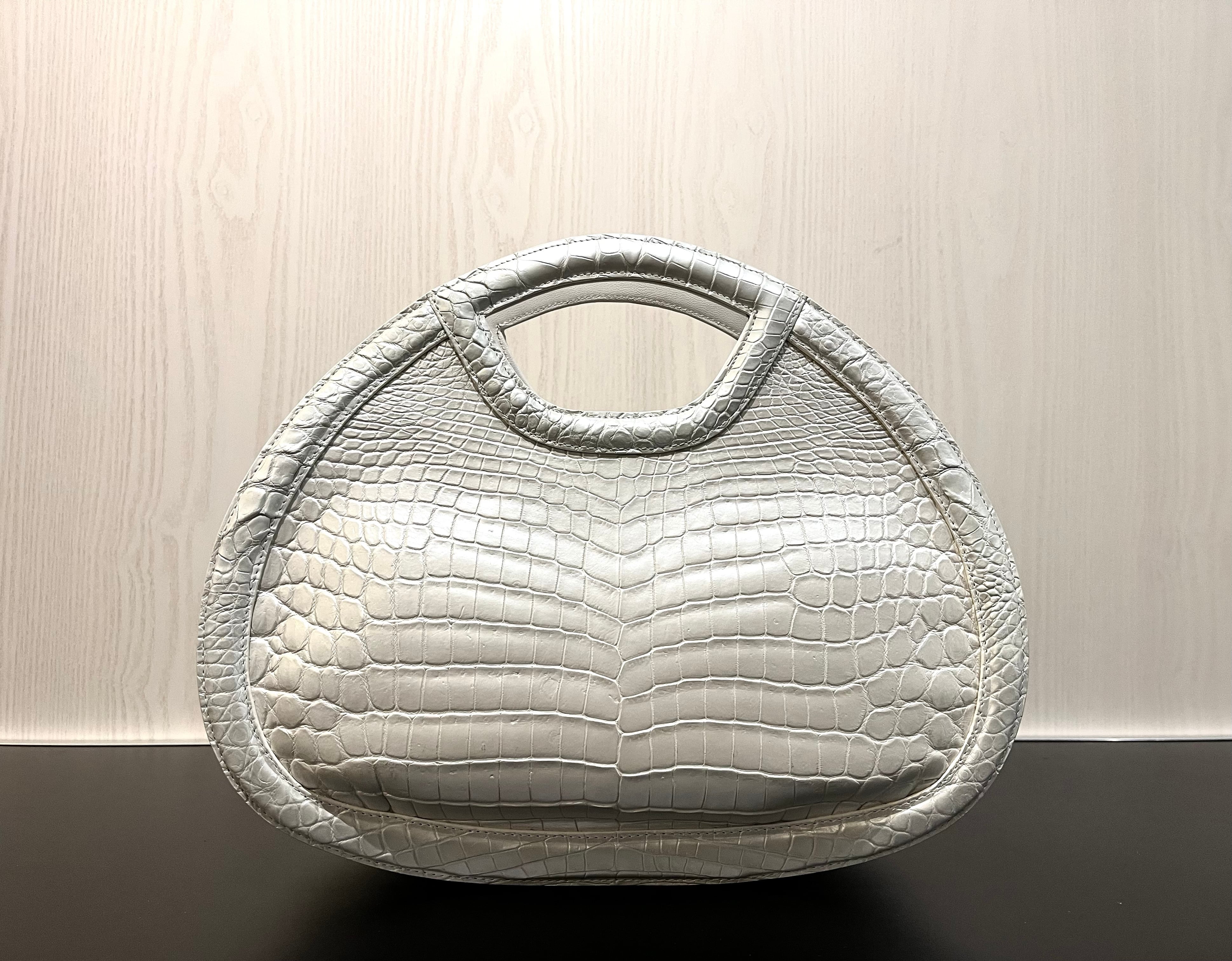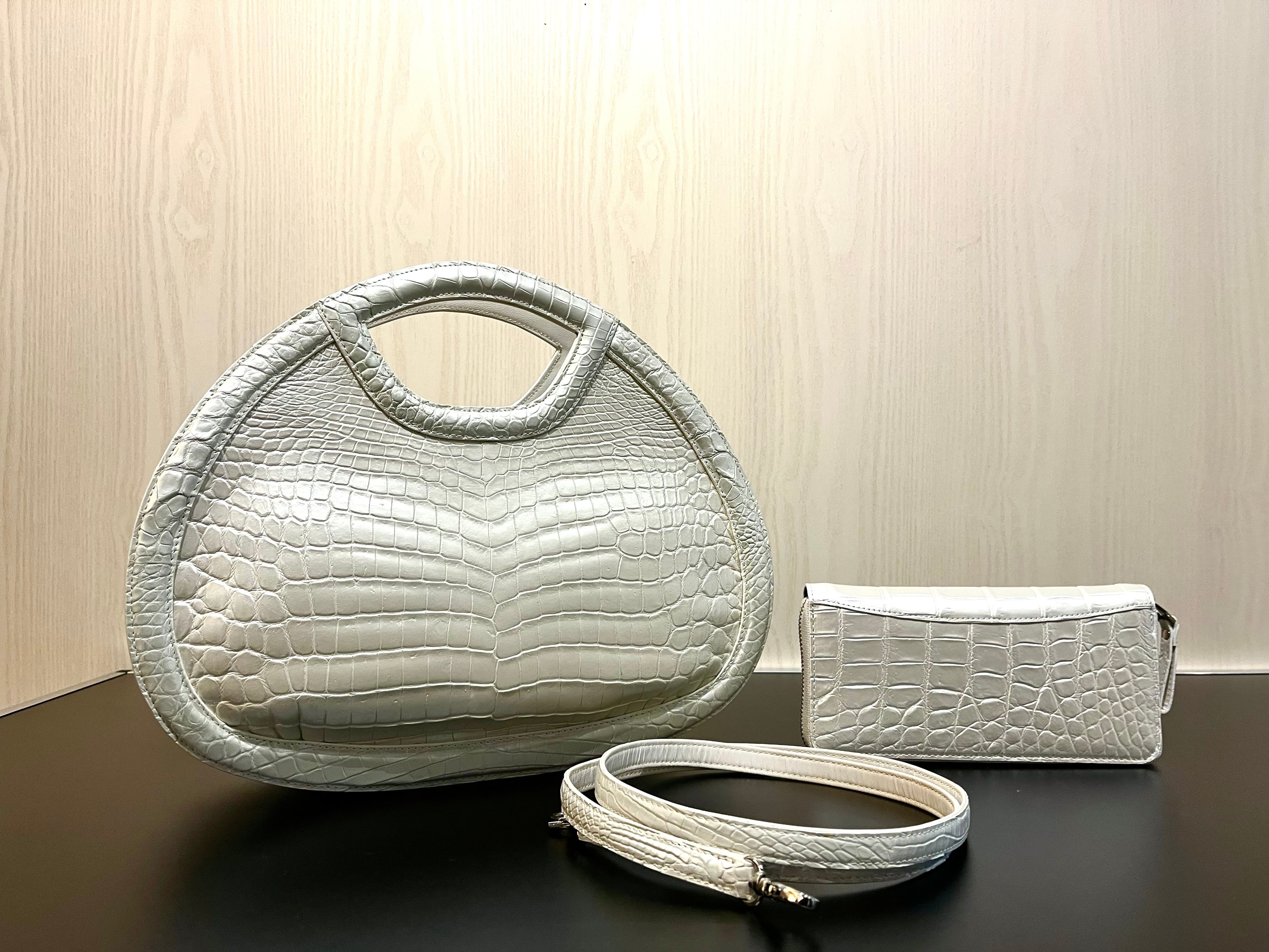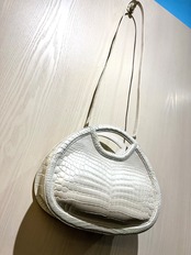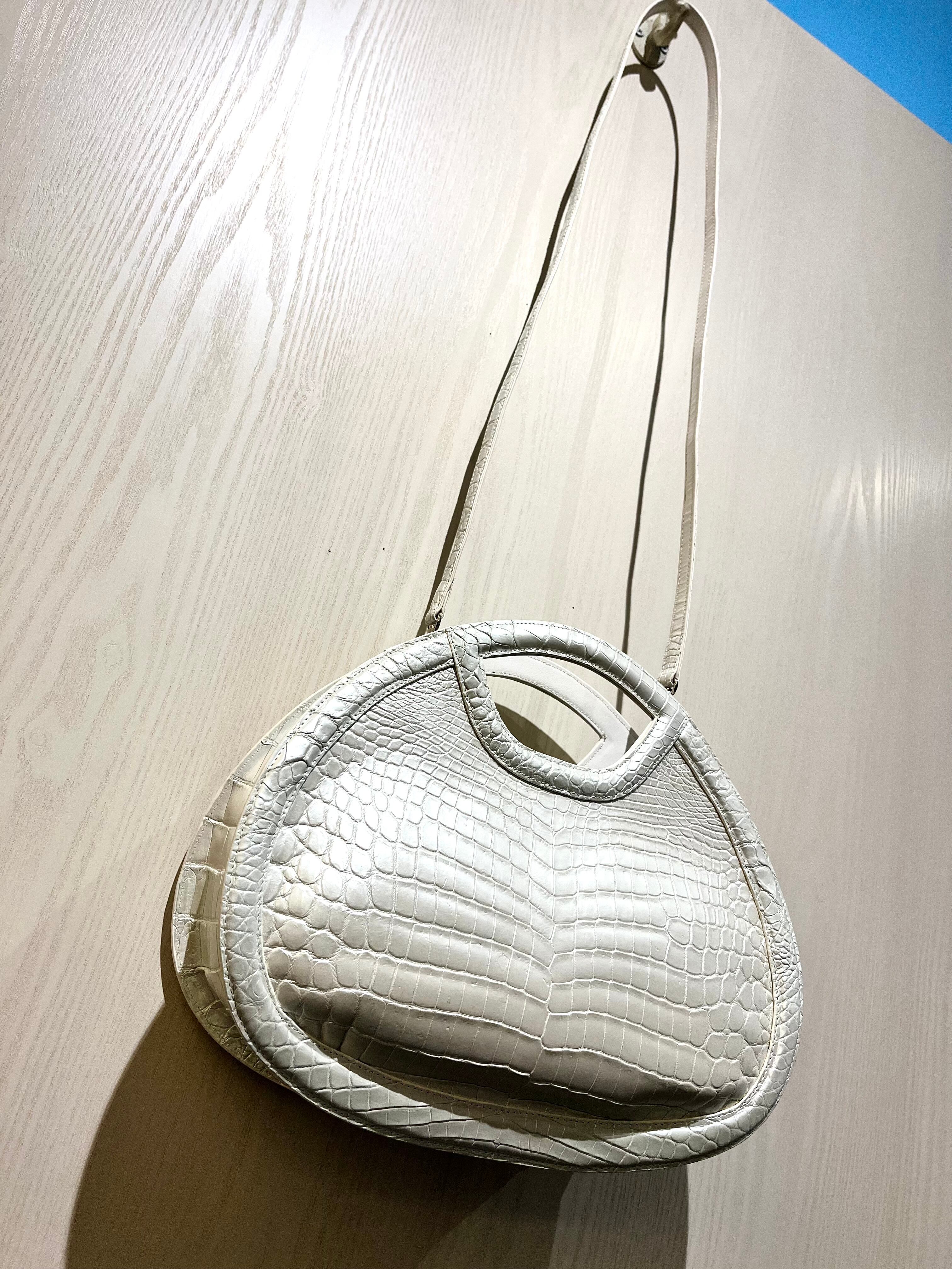 パールホワイトの輝きを纏った、個性的なデザインのハンド・ショルダーバッグです。希少なクロコダイルレザーを使用しており、その美しいパールホワイトは持つ方のスタイルを一層引き立てる特別なアイテムとなっています。エレガントでありながらも、他にはないユニークな形状が特徴です。手作業による丁寧な仕上げが施され、上質な素材感は手にした瞬間に感じられます! 機能性も兼ね備えた2way仕様で、ハンドバッグとしてもショルダーバッグとしても使える便利さが魅力です。日常のお出かけから特別なシーンまで、様々なスタイルで楽しんでいただけます!