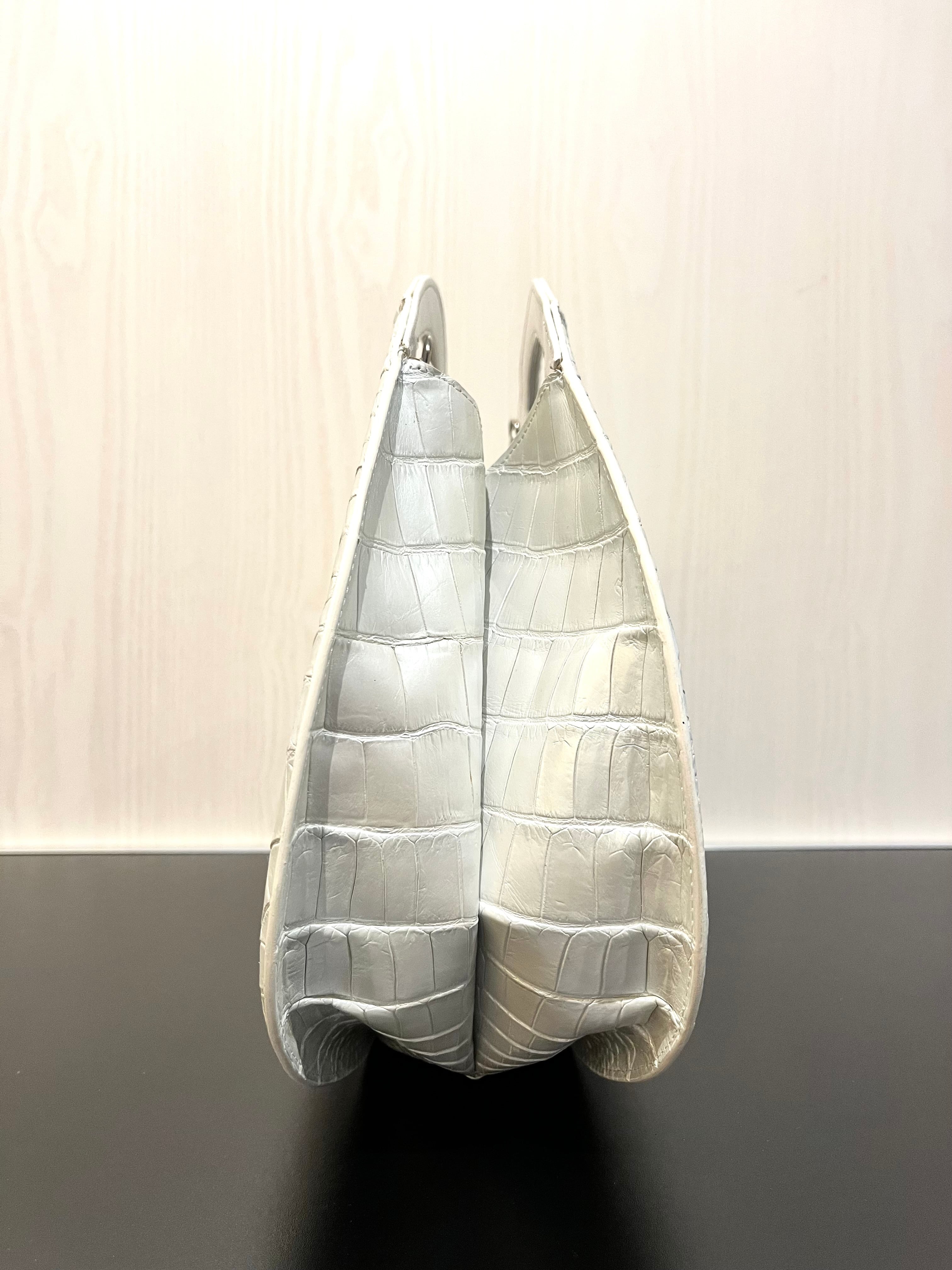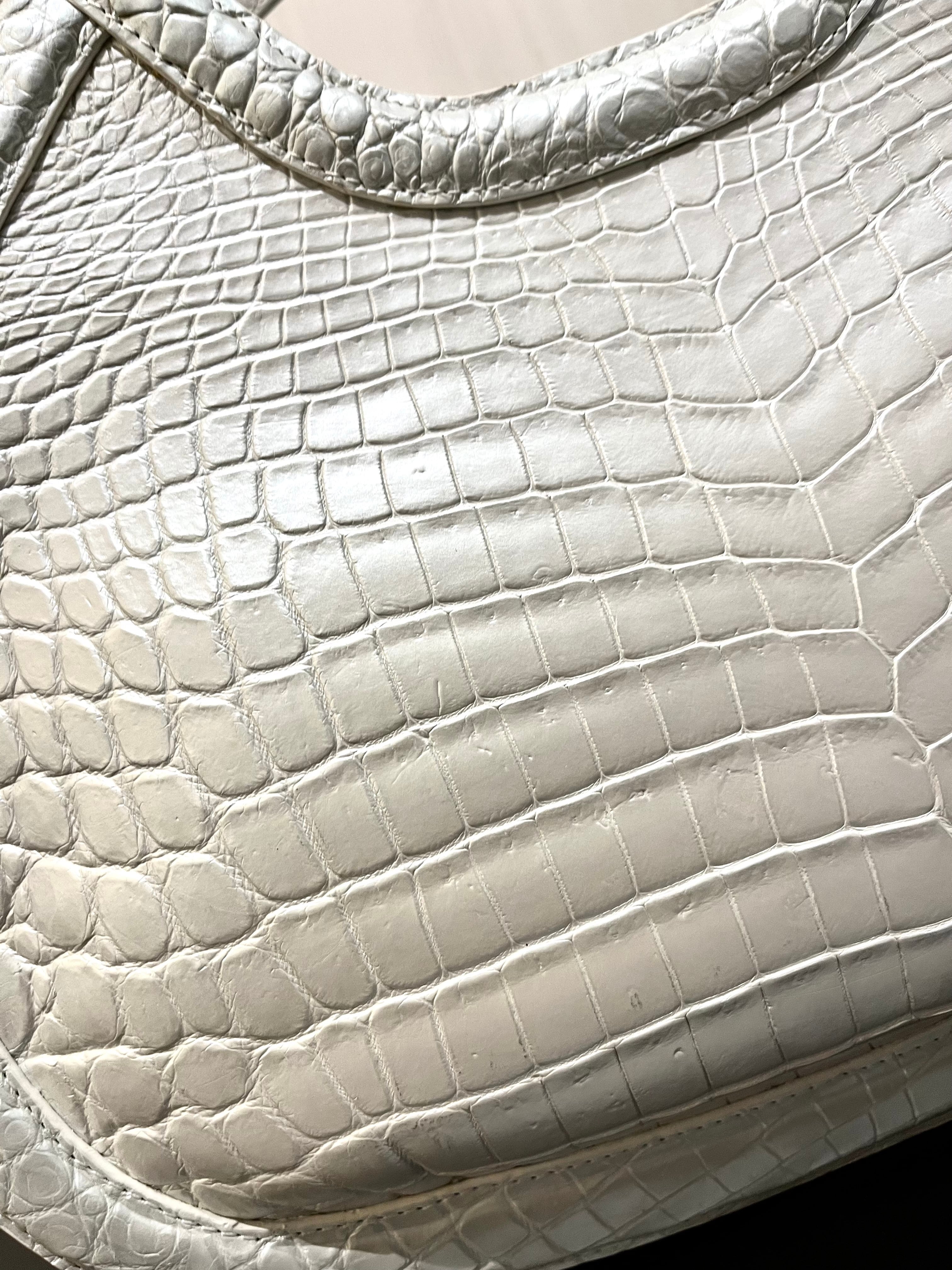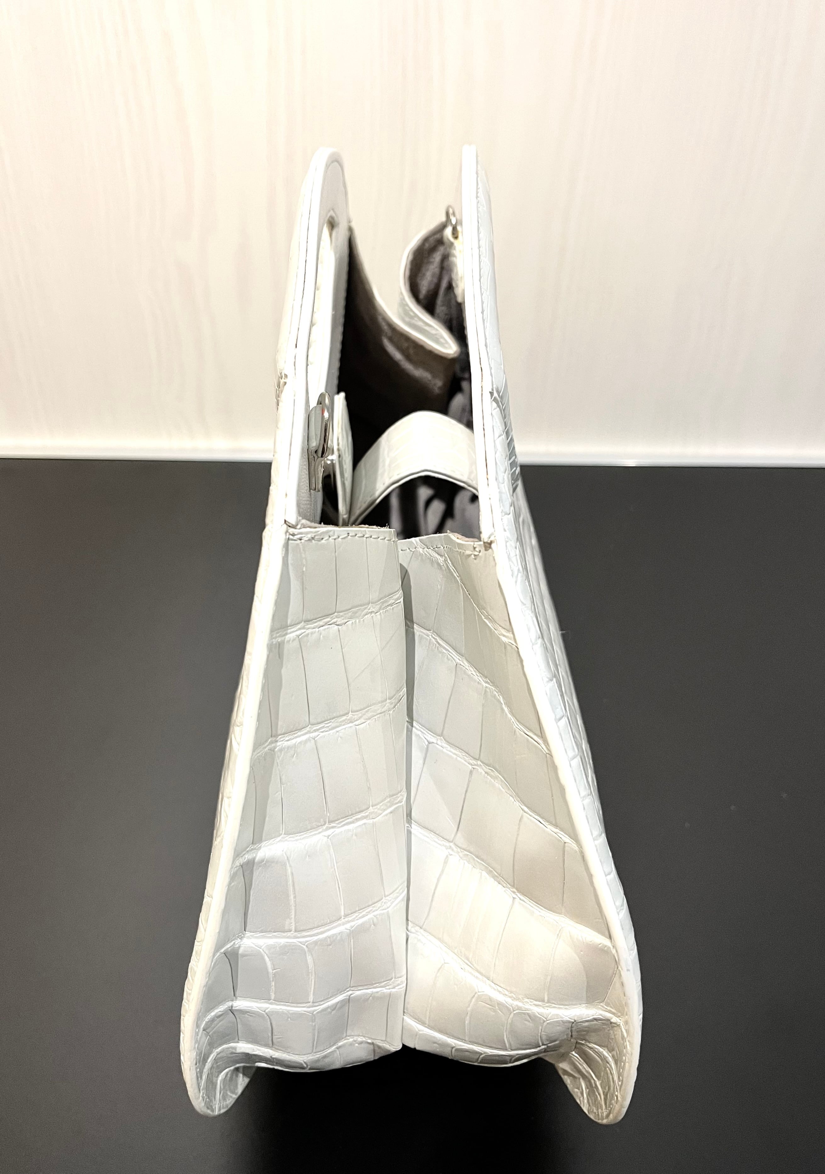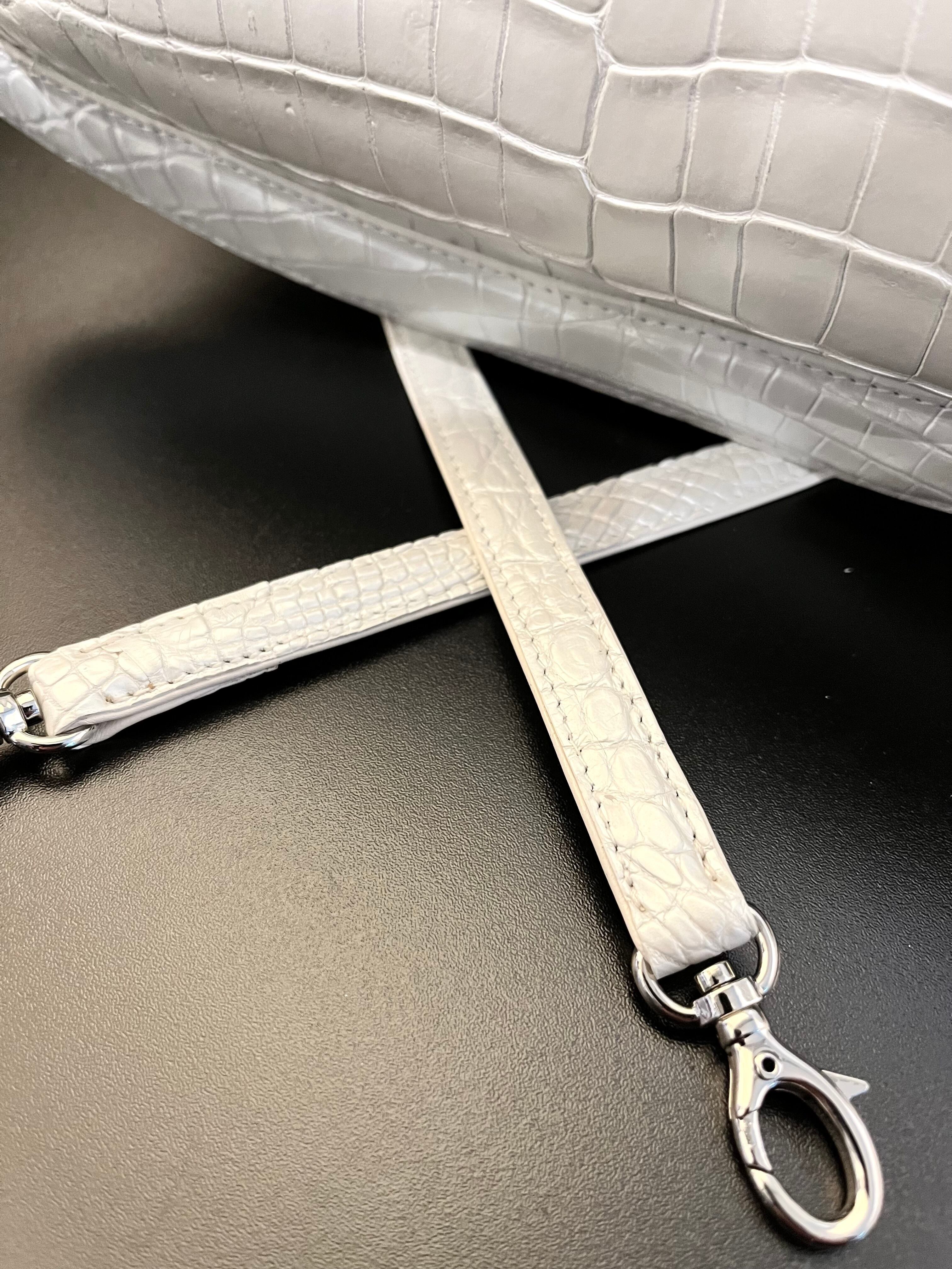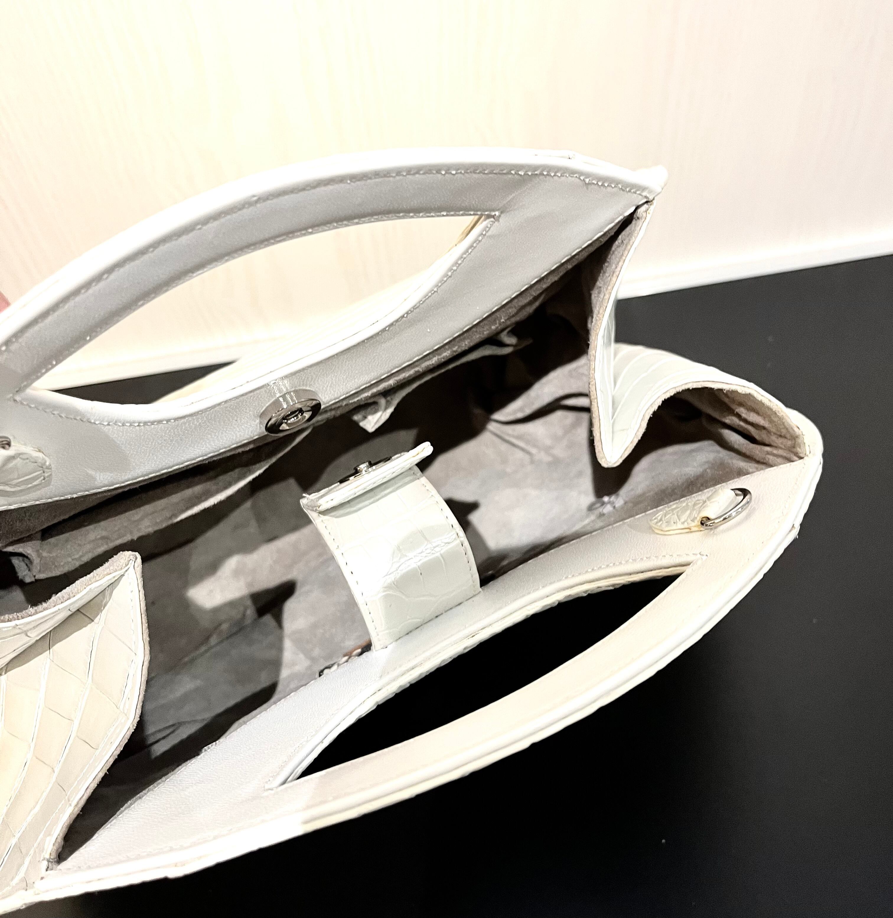パールホワイトの輝きを纏った、個性的なデザインのハンド・ショルダーバッグです。希少なクロコダイルレザーを使用しており、その美しいパールホワイトは持つ方のスタイルを一層引き立てる特別なアイテムとなっています。エレガントでありながらも、他にはないユニークな形状が特徴です。手作業による丁寧な仕上げが施され、上質な素材感は手にした瞬間に感じられます! 機能性も兼ね備えた2way仕様で、ハンドバッグとしてもショルダーバッグとしても使える便利さが魅力です。日常のお出かけから特別なシーンまで、様々なスタイルで楽しんでいただけます!