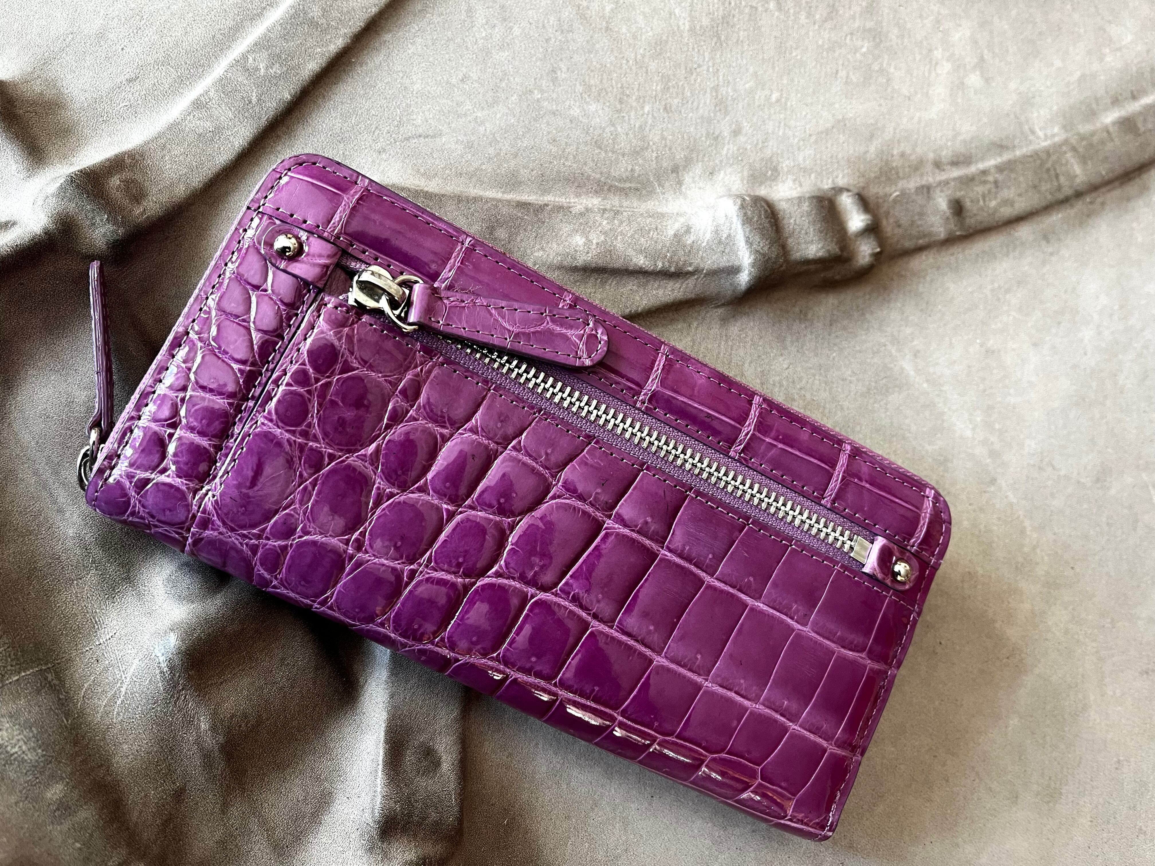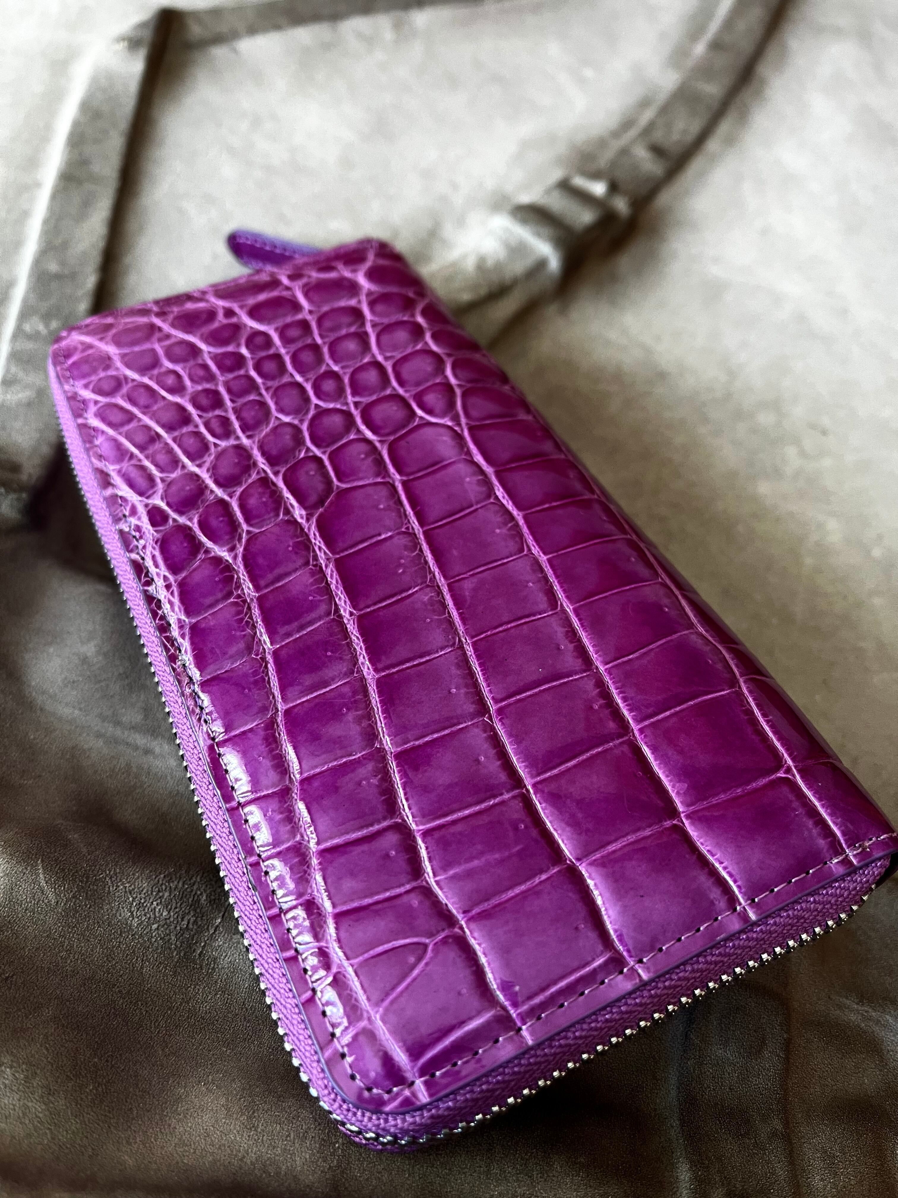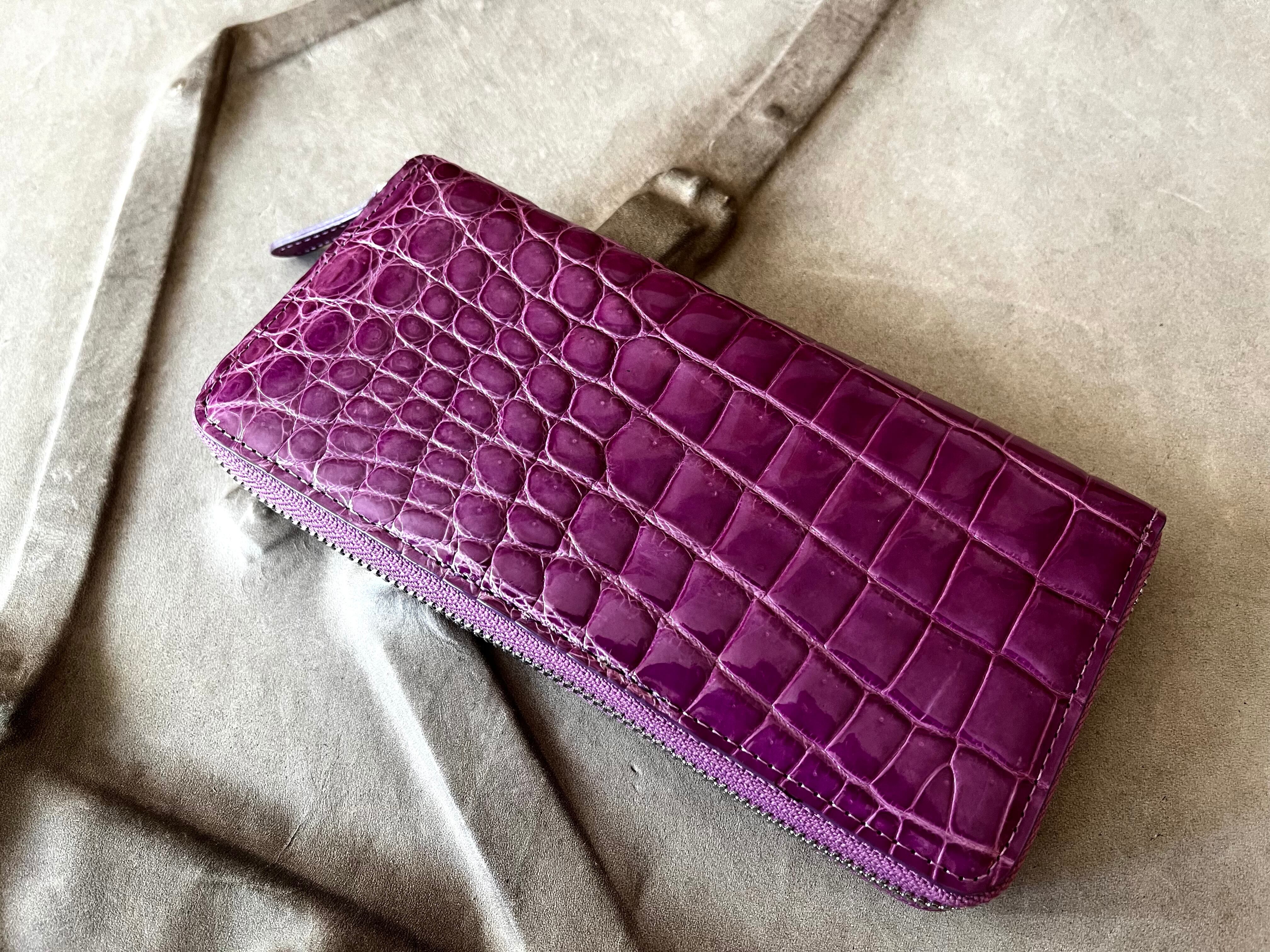 美しいクロコダイルシャイニーを使用したロングウォレットです。鮮やかなパープルカラーが目を引き、シンプルなデザインながらも高級感漂うアイテムに仕上がっています。日常使いはもちろん、特別なシーンにもぴったりな一品です。