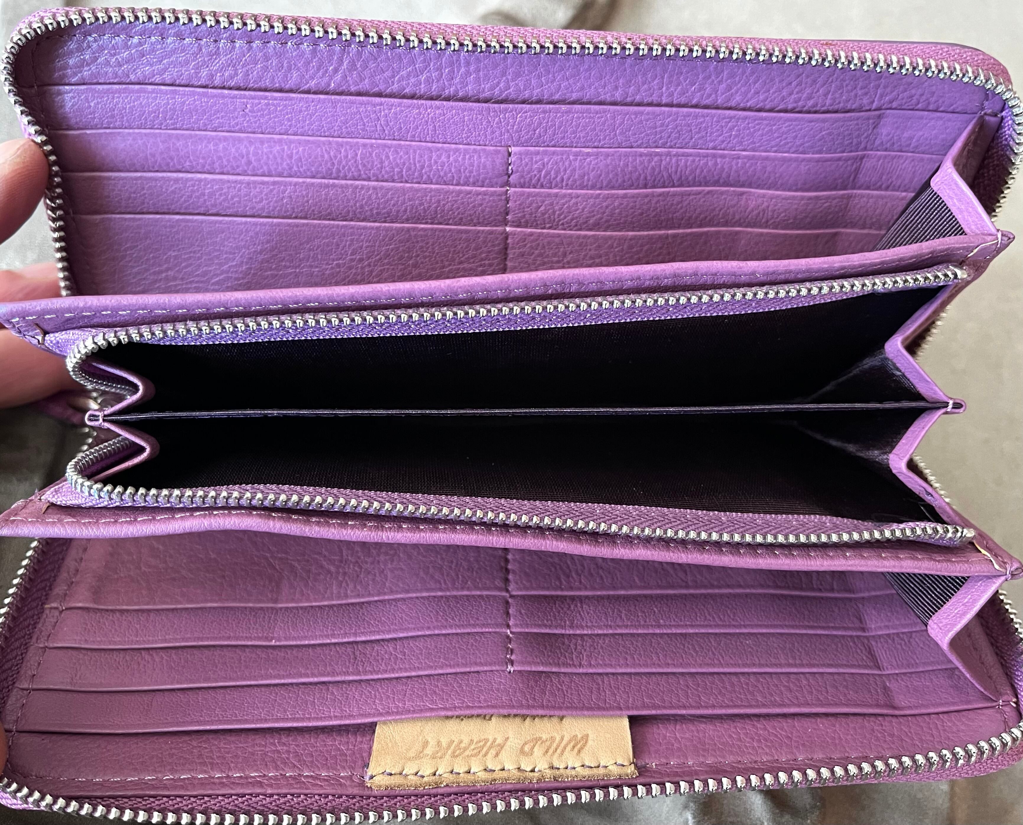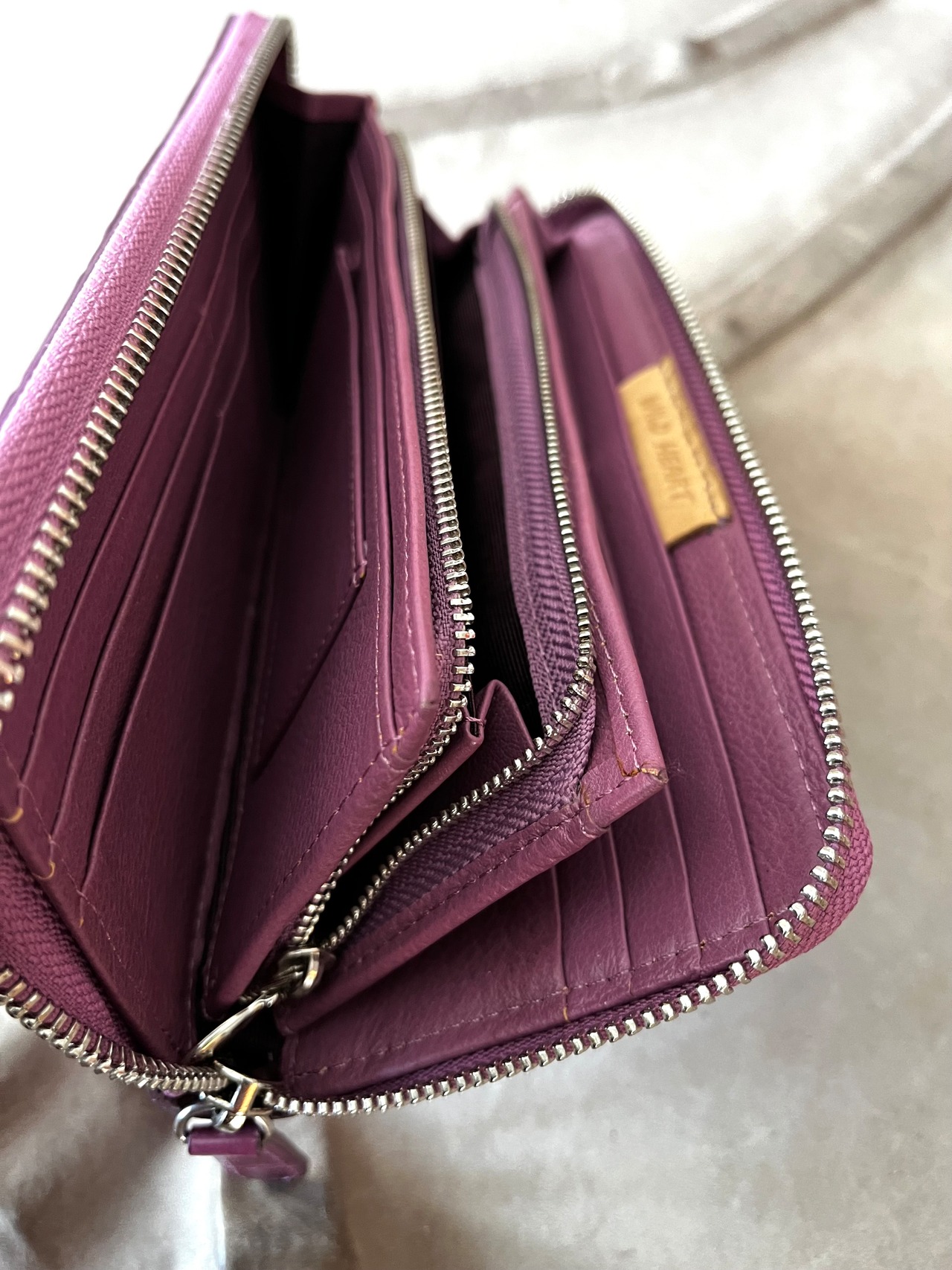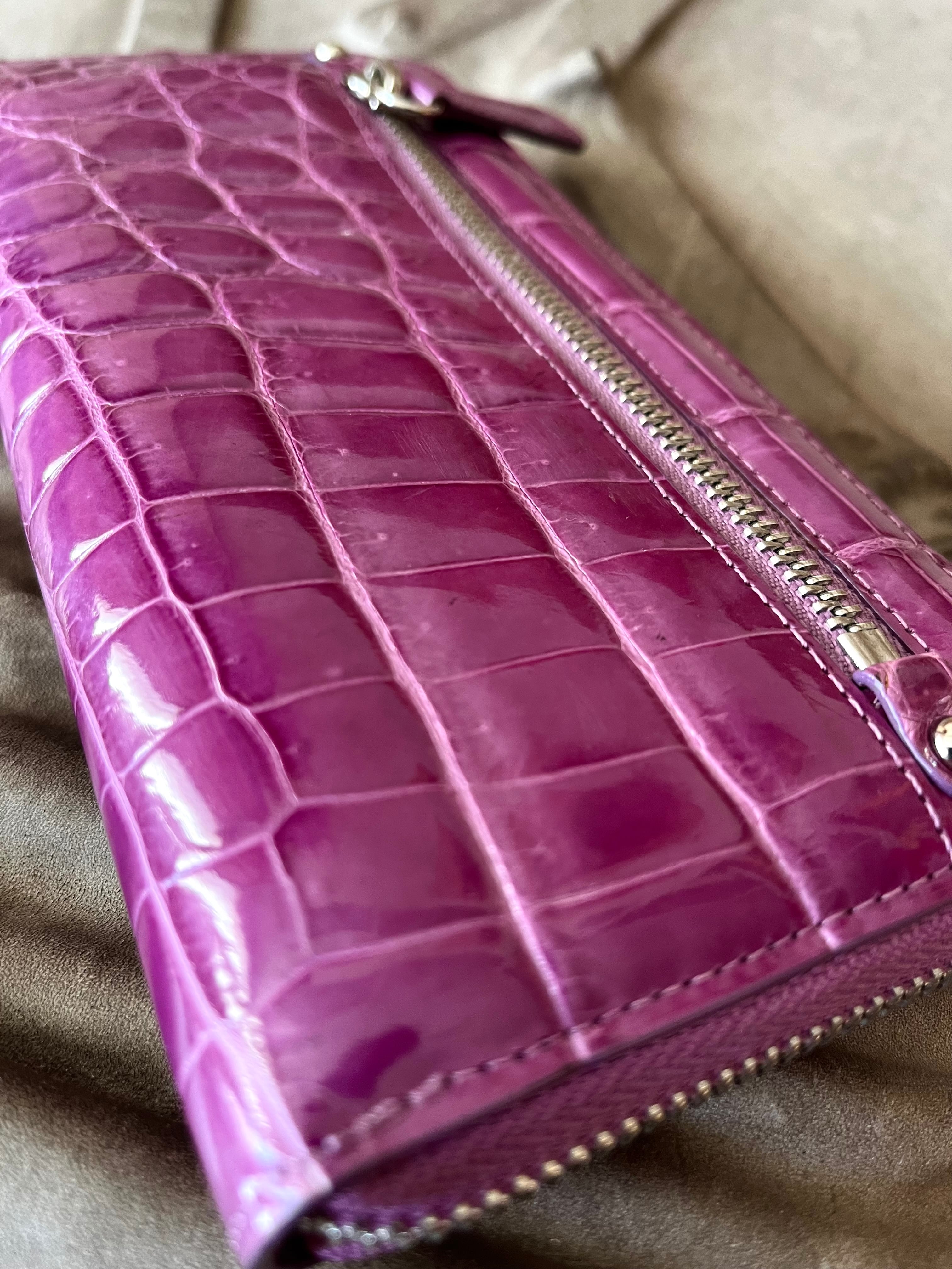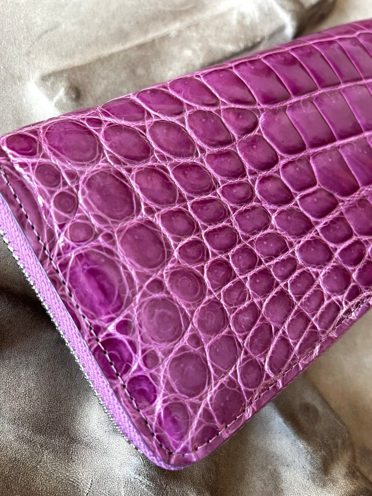 美しいクロコダイルシャイニーを使用したロングウォレットです。鮮やかなパープルカラーが目を引き、シンプルなデザインながらも高級感漂うアイテムに仕上がっています。日常使いはもちろん、特別なシーンにもぴったりな一品です。