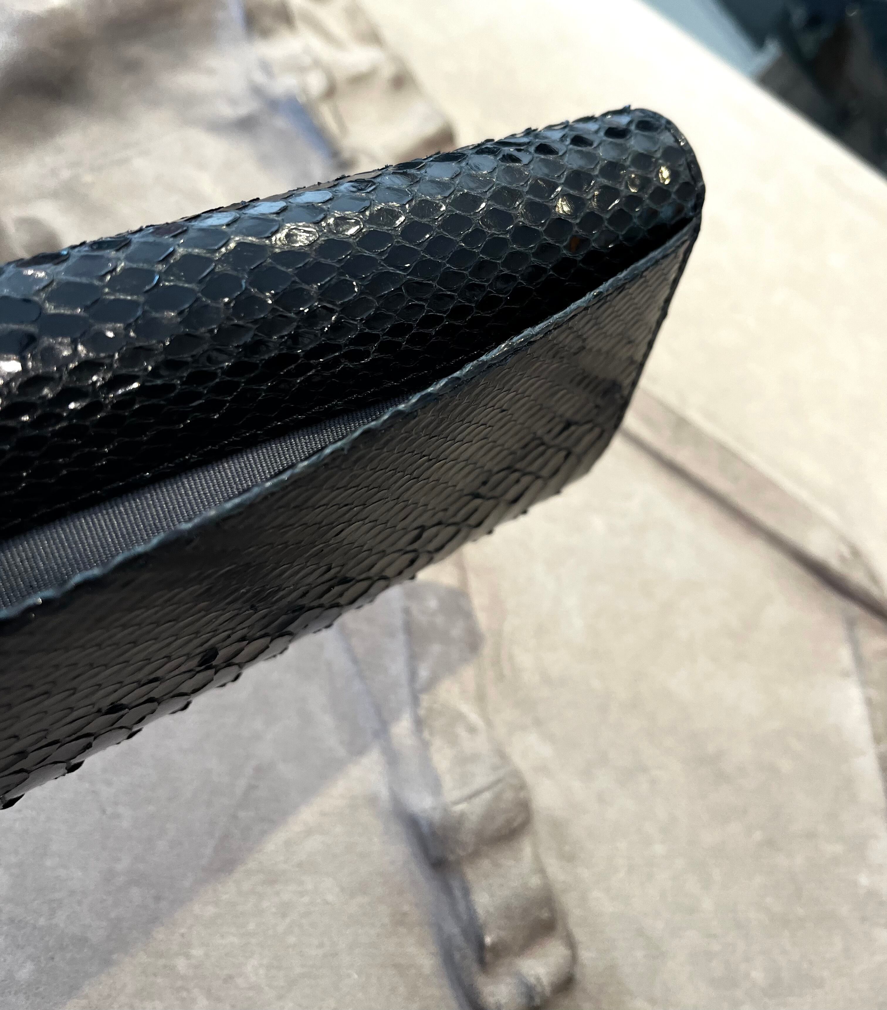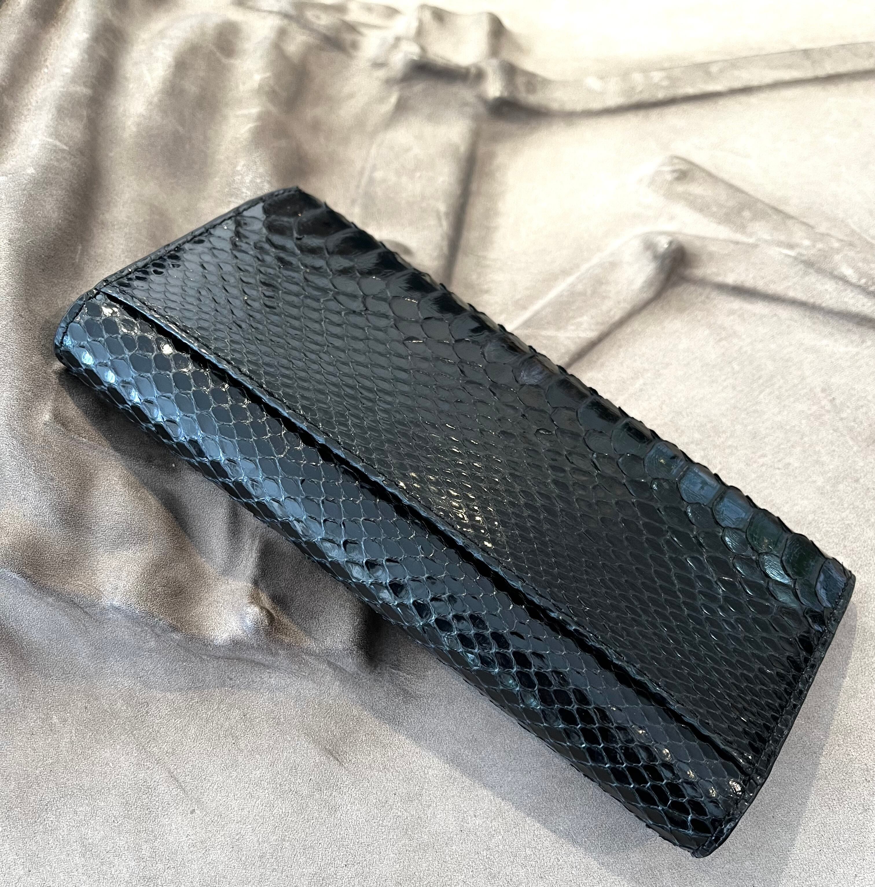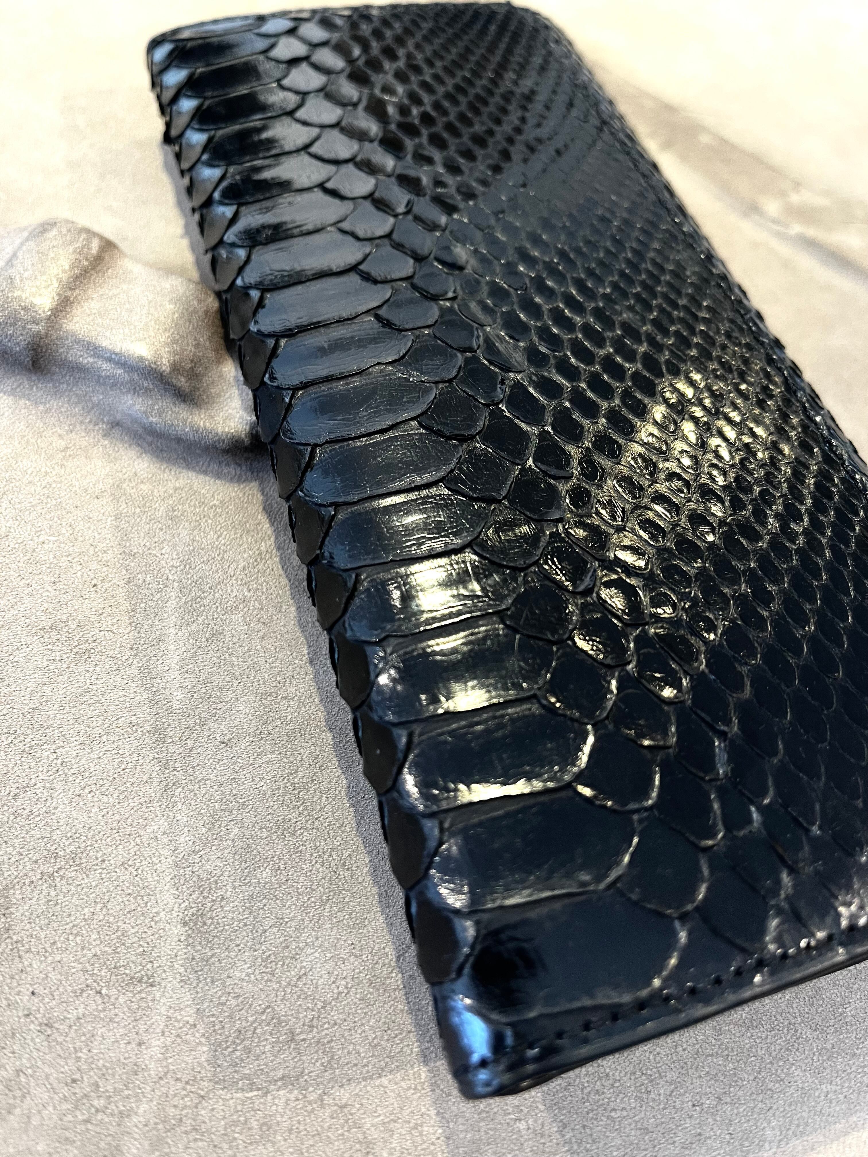 光沢のあるパイソンレザーを使用したフラップタイプのロングウォレットです。洗練されたデザインは、収納力にも優れ、必要なアイテムをしっかりと整理できます。日常使いはもちろん、特別な場面でもあなたのスタイルを一層引き立てます。光を受けて美しく輝くパイソンの風合いが、持つ人の魅力を引き出すことでしょう。