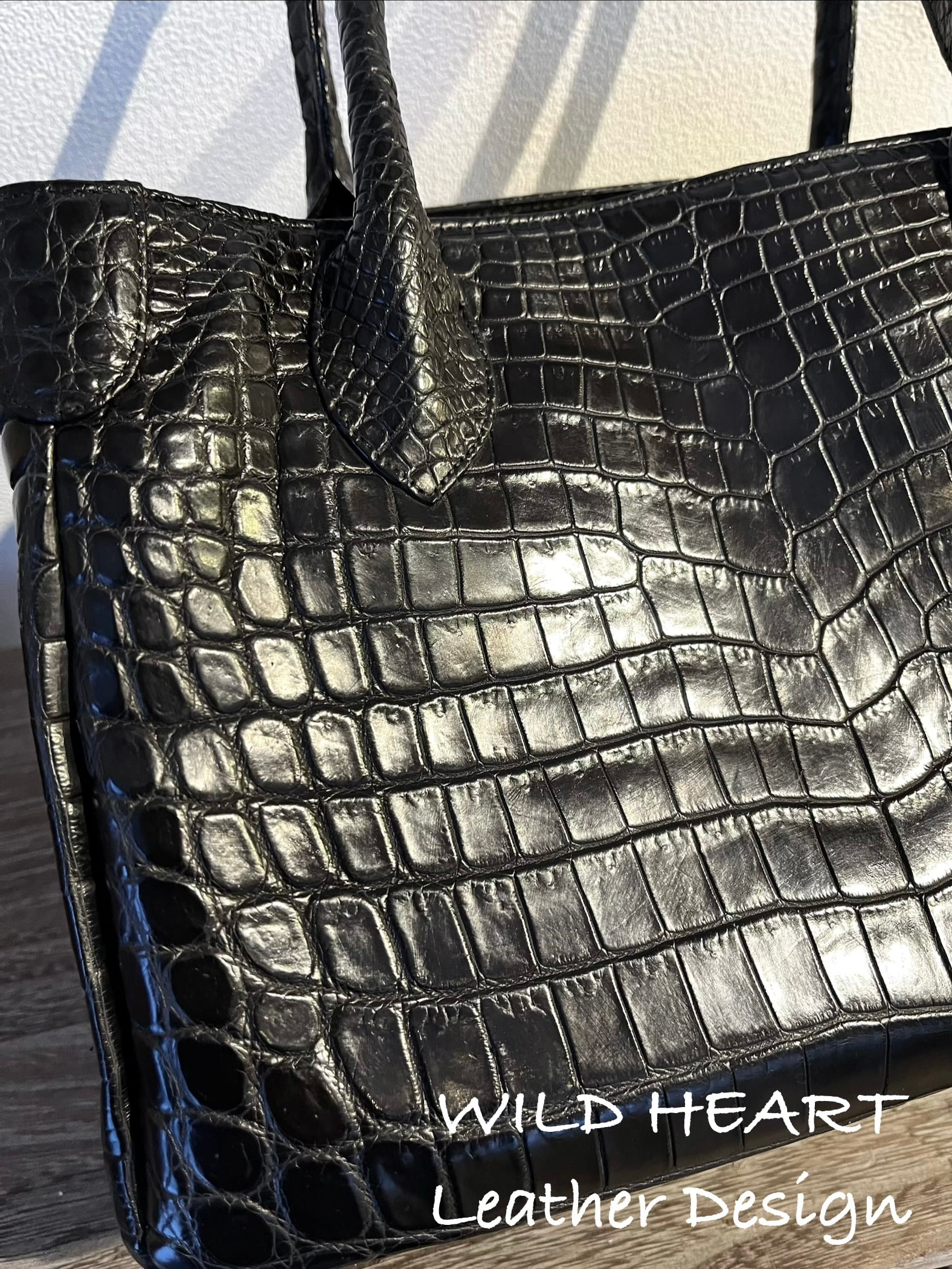 しっかりと厚みを持ちながらも柔らかな仕上げ、両面センター取りのクロコダイルを使用したトレンド感のあるハンドトートです。洗練されたデザインは、収納力にも優れ、日常使いはもちろん、特別なシーンでもあなたのスタイルを引き立ててくれます。深いブラックの色合いと、クロコの風格があなたの魅力を際立たせるアイテムです。