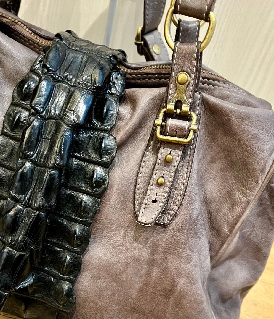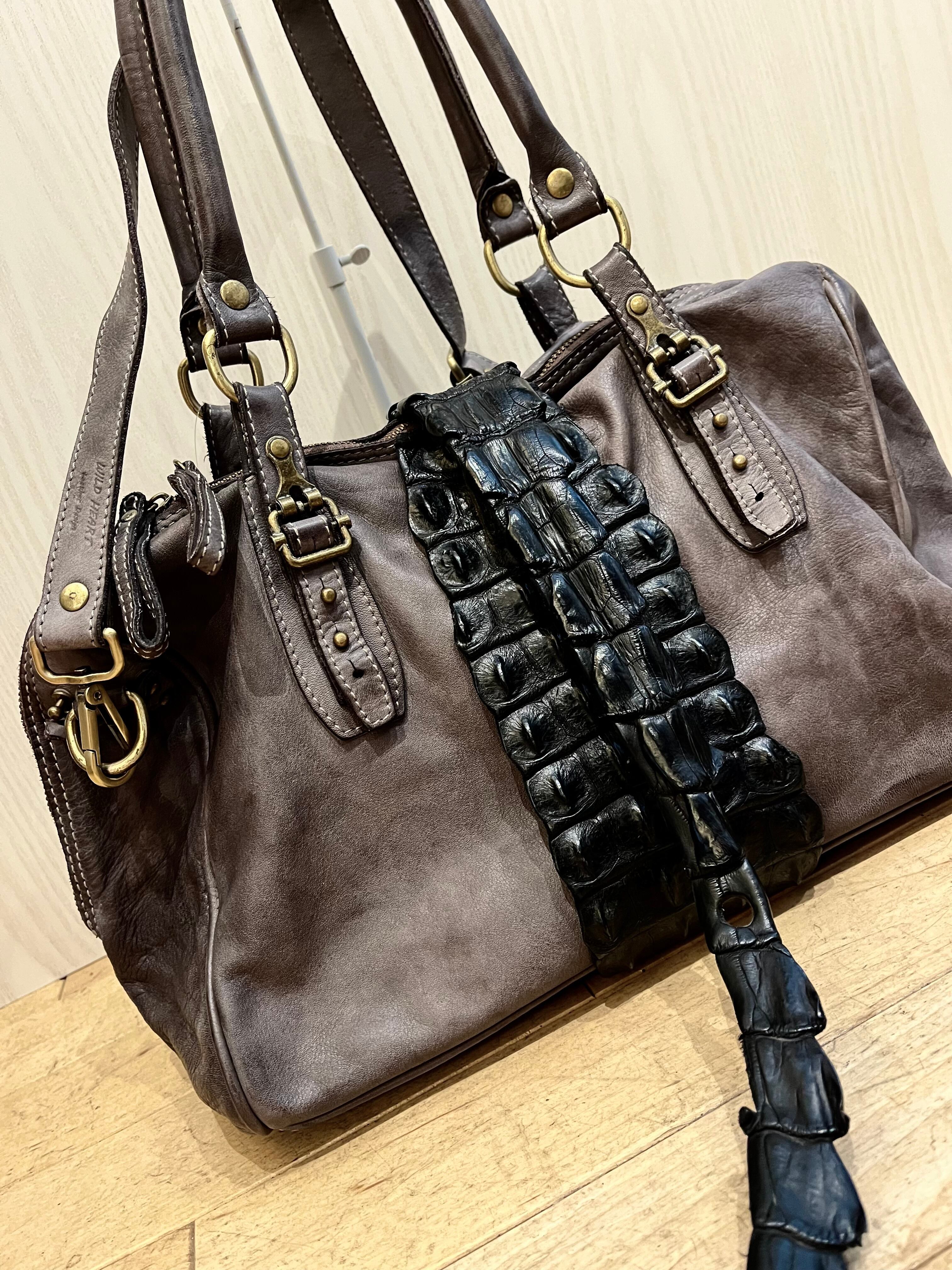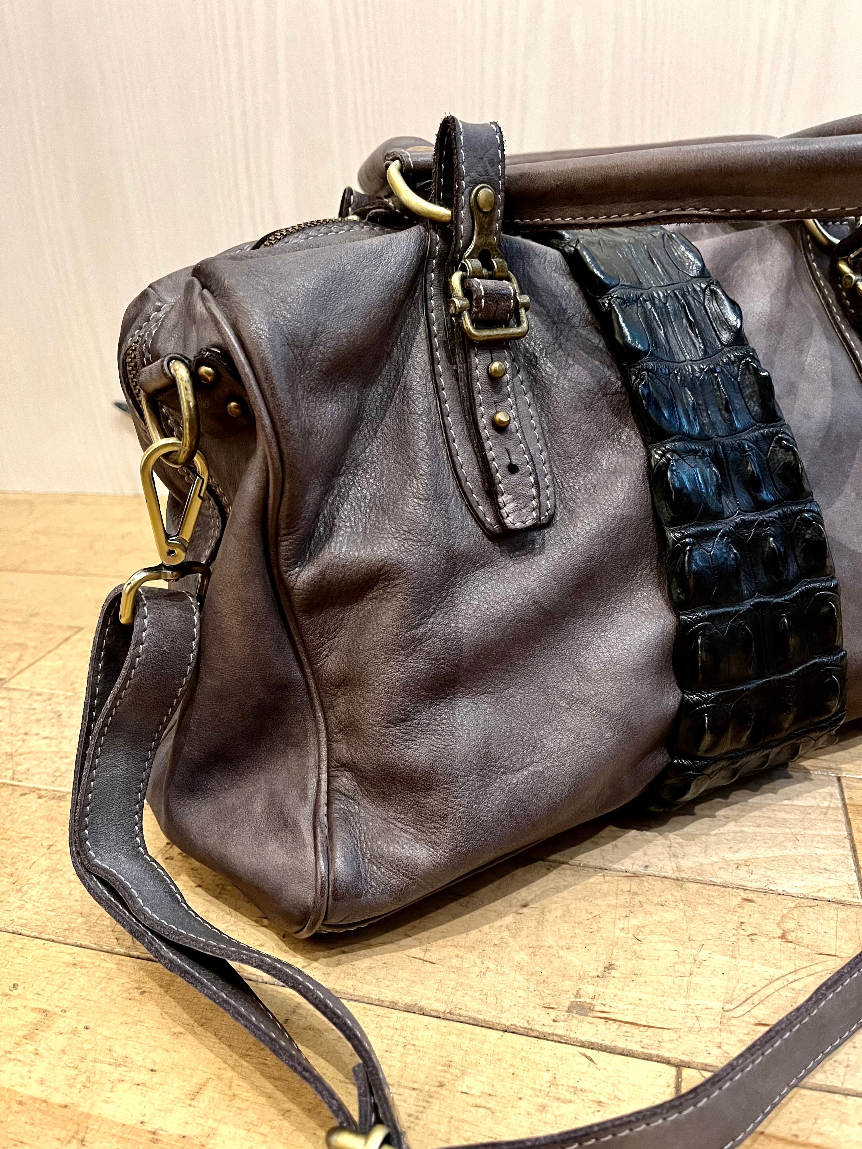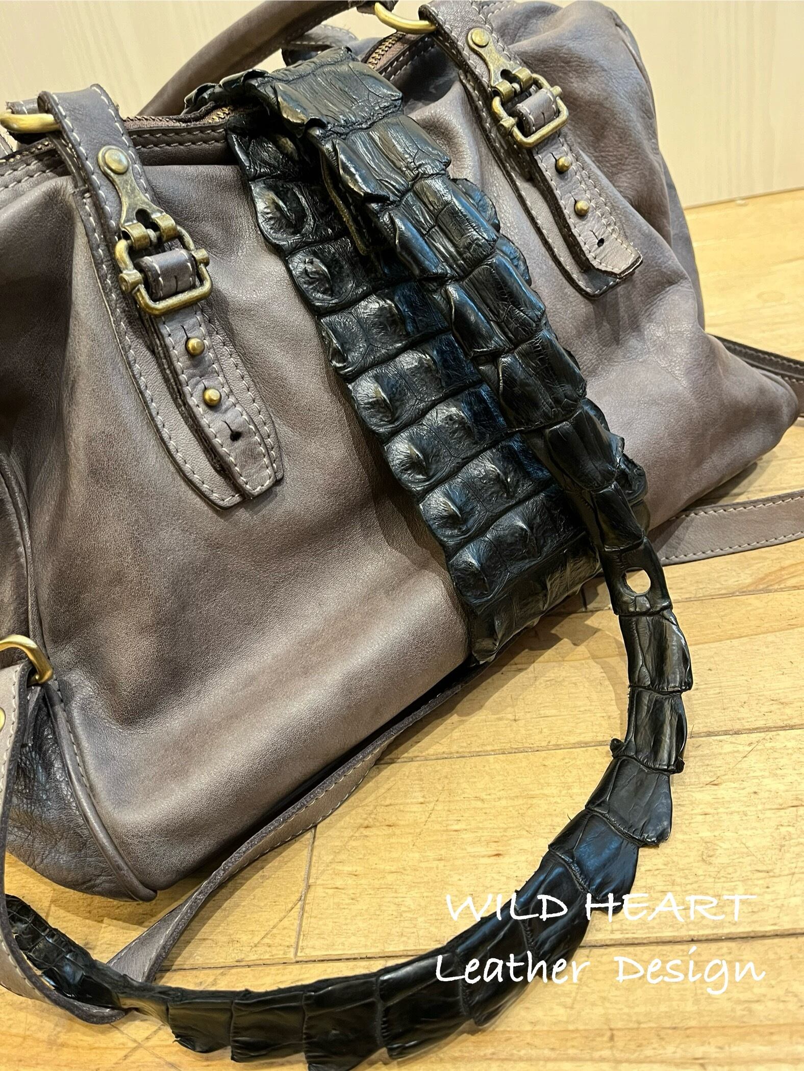 ヴィンテージ加工で仕上げたカーフレザーでバッグを創り、クロコダイルバックストラップを巻き付けた斬新なデザイン、これもまた他には無いアイテムです。各使用の金属パーツも革同様にヴィンテージ加工仕上げで雰囲気を上げています。