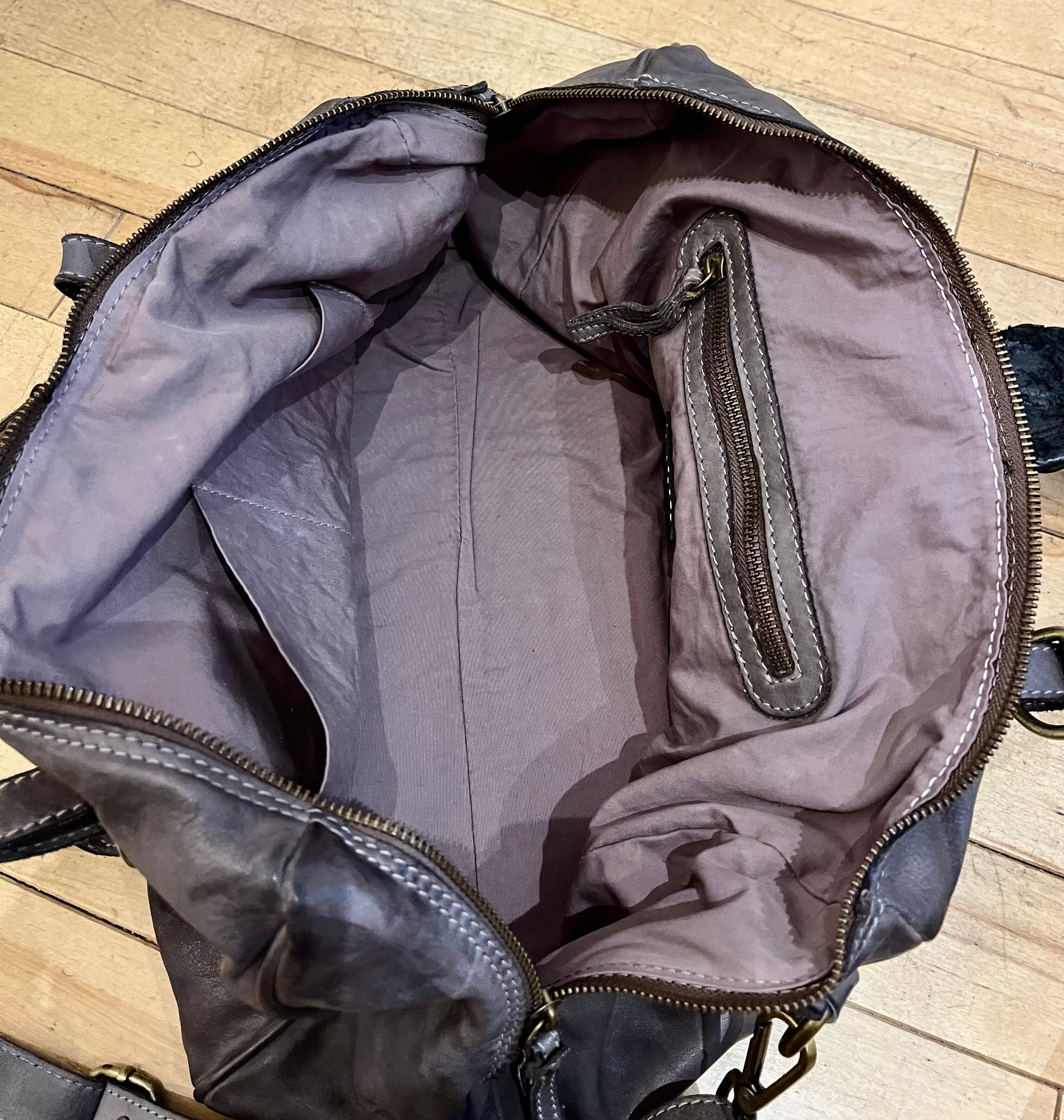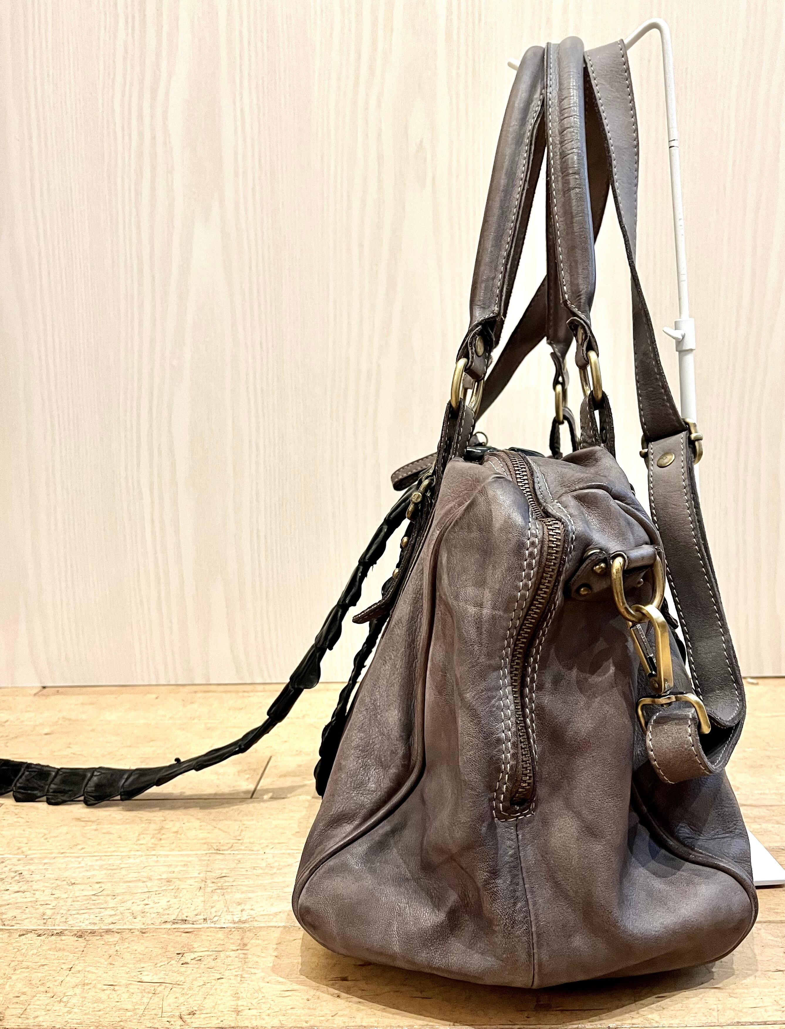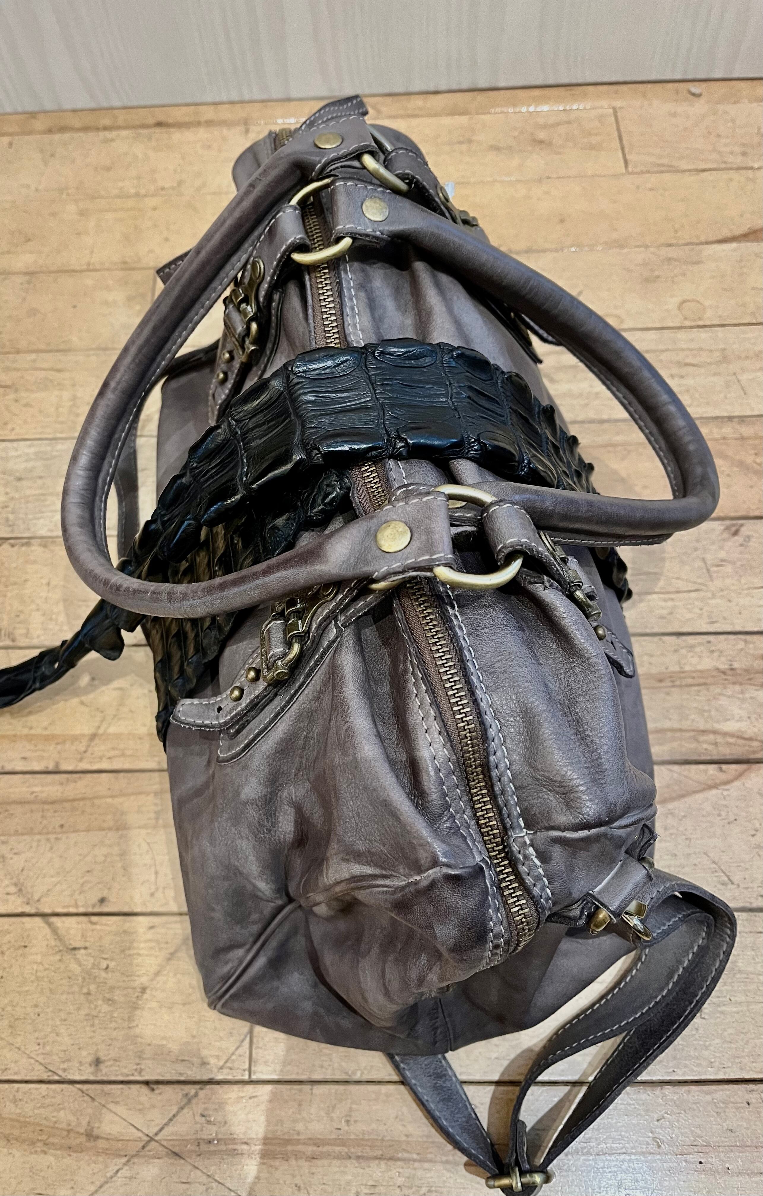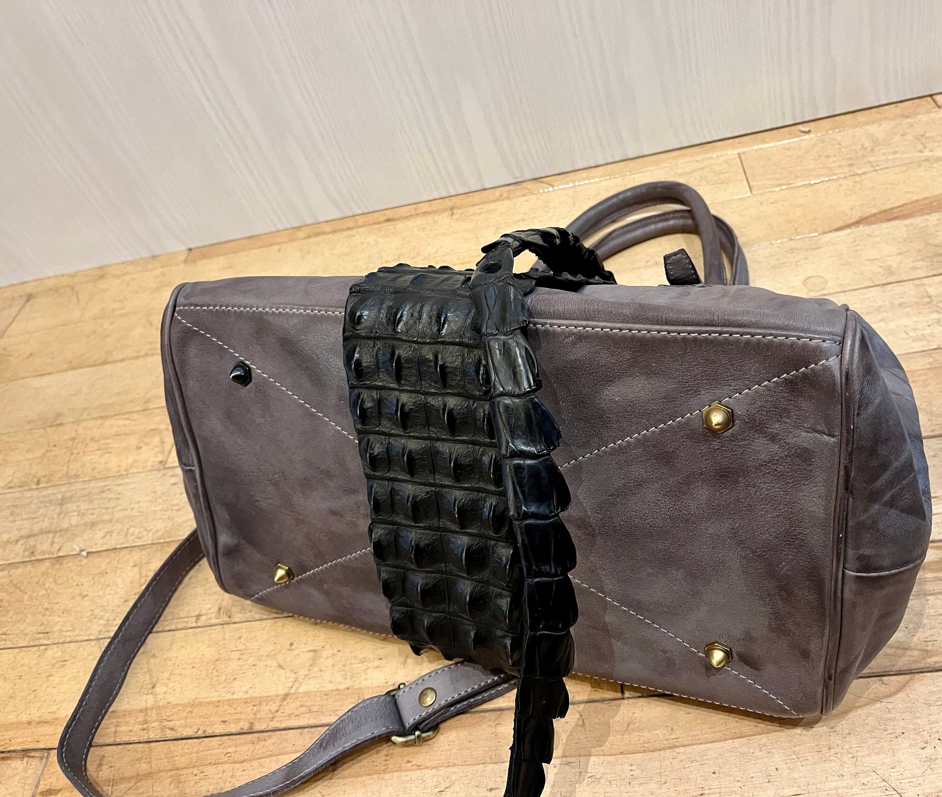 ヴィンテージ加工で仕上げたカーフレザーでバッグを創り、クロコダイルバックストラップを巻き付けた斬新なデザイン、これもまた他には無いアイテムです。各使用の金属パーツも革同様にヴィンテージ加工仕上げで雰囲気を上げています。