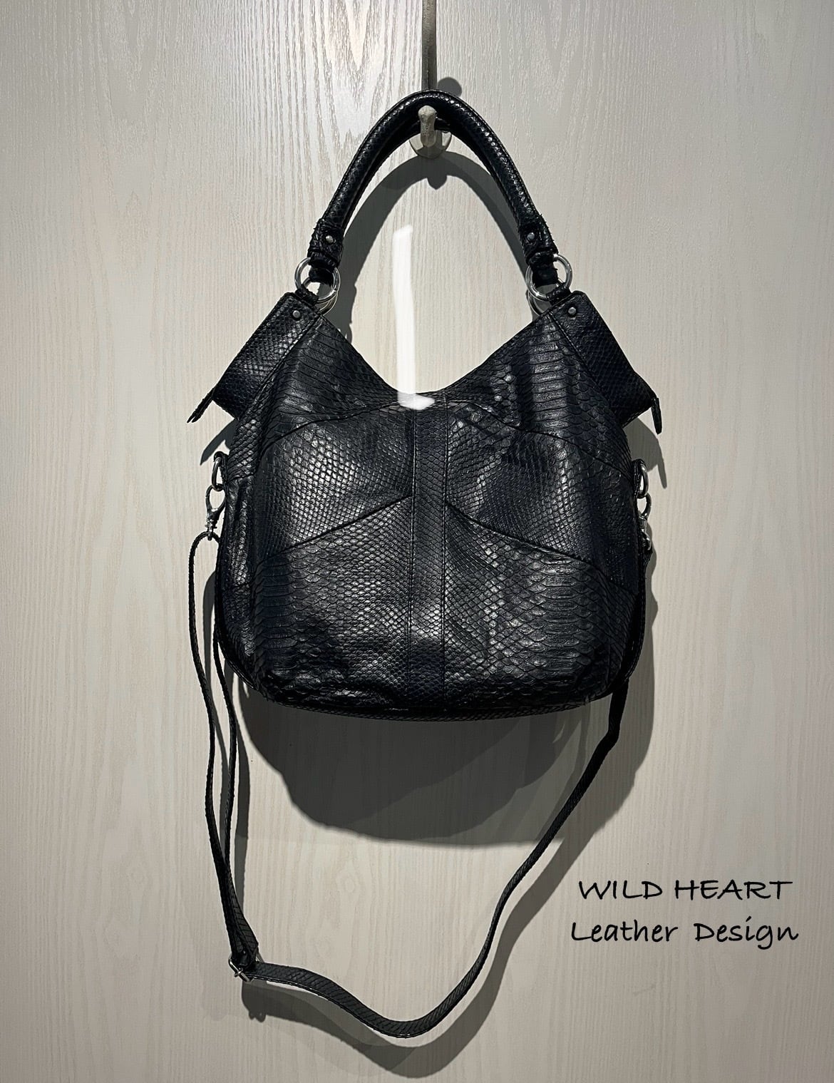 クールな素材でカジュアルにも使えるよう仕上げてみました。どんなシーンでも使いやすいデザインで、軽やかな印象で持ち運びも楽なのが特徴のバッグです。パイソンレザー特有の模様が、使うほどに個性的な風合いへとエイジングされて行くのもお楽しみいただけます。