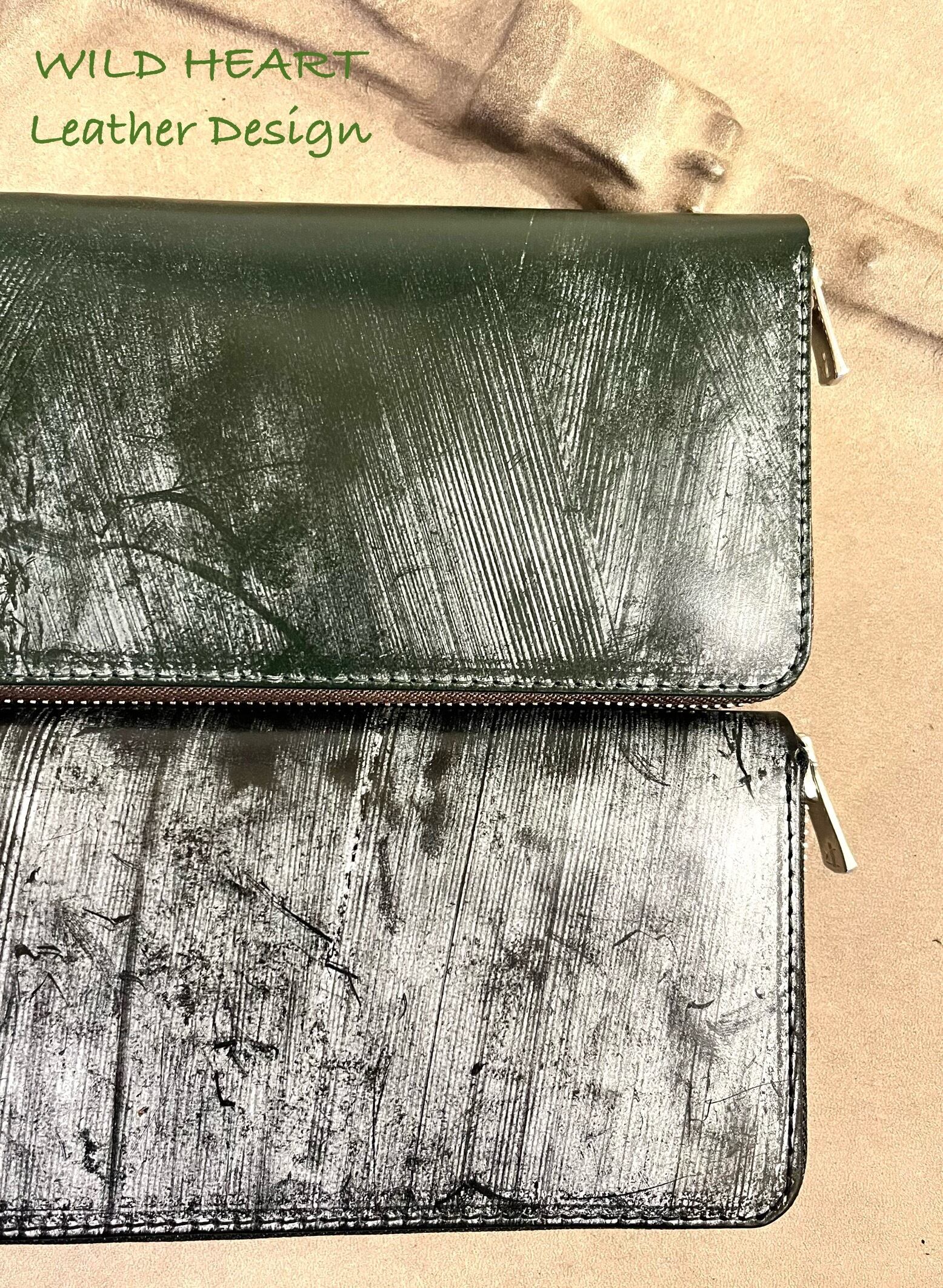 白くなっているのは表面にロウが染みだしたもので、使うと元の革の色になって行きます。